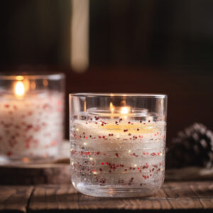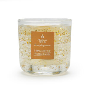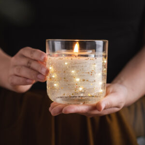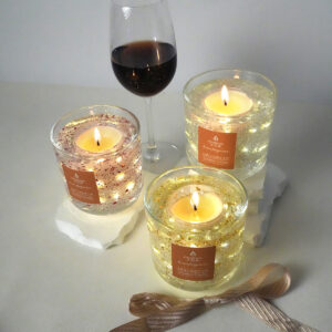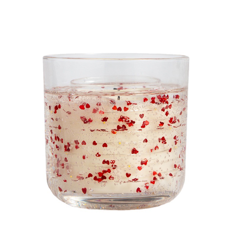 Carefully crafted with natural soy wax wicks for a clean burn, each candle is encased in shimmering jelly wax, creating a dreamlike secret world filled with floating hearts or stars, delicately adorned with colorful candle fragments, and a delicate LED light ring gently encircling the candle’s interior.